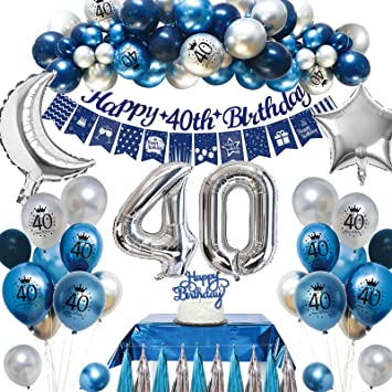 40th Birthday Decorations Men - 40th Birthday Balloons Navy Blue Metallic Blue Silver Balloon Kit - Happy 40th Birthday Banner, 40 Foil Balloon, Tablecloth, Cake Topper for