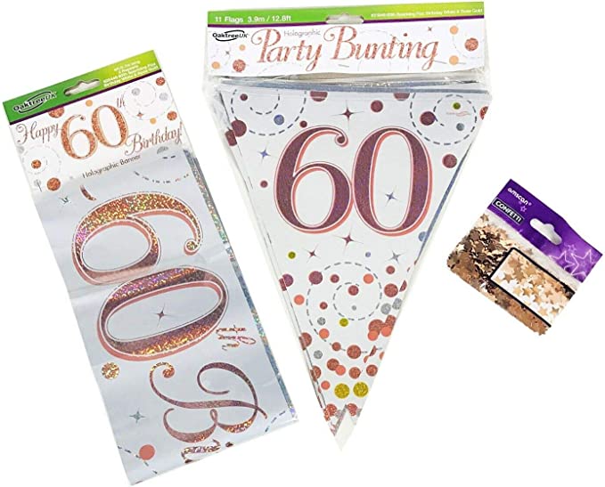 " 60th Birthday Decoration Kit: Rose Gold Banner, Bunting, Confetti for Him and Her"