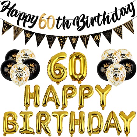 "Black Gold 60th Birthday Decorations Kit: Happy Birthday Banner, Triangle Flag Banner, Foil Banner Balloons, and Confetti Latex Balloons"